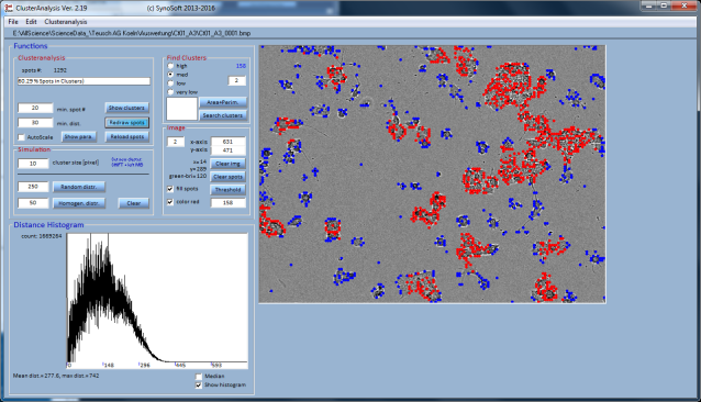 ClusterA is an analysis program for cluster formation. The user can define cell cluster parameters and the program calculates cluster size, number and percentage of cells in clusters.